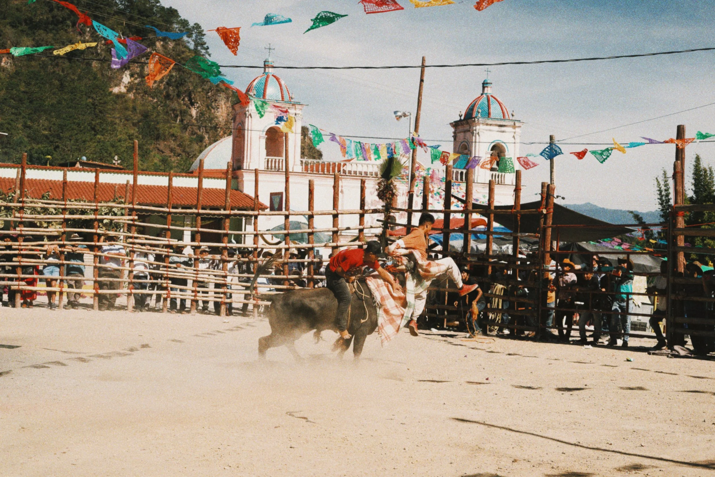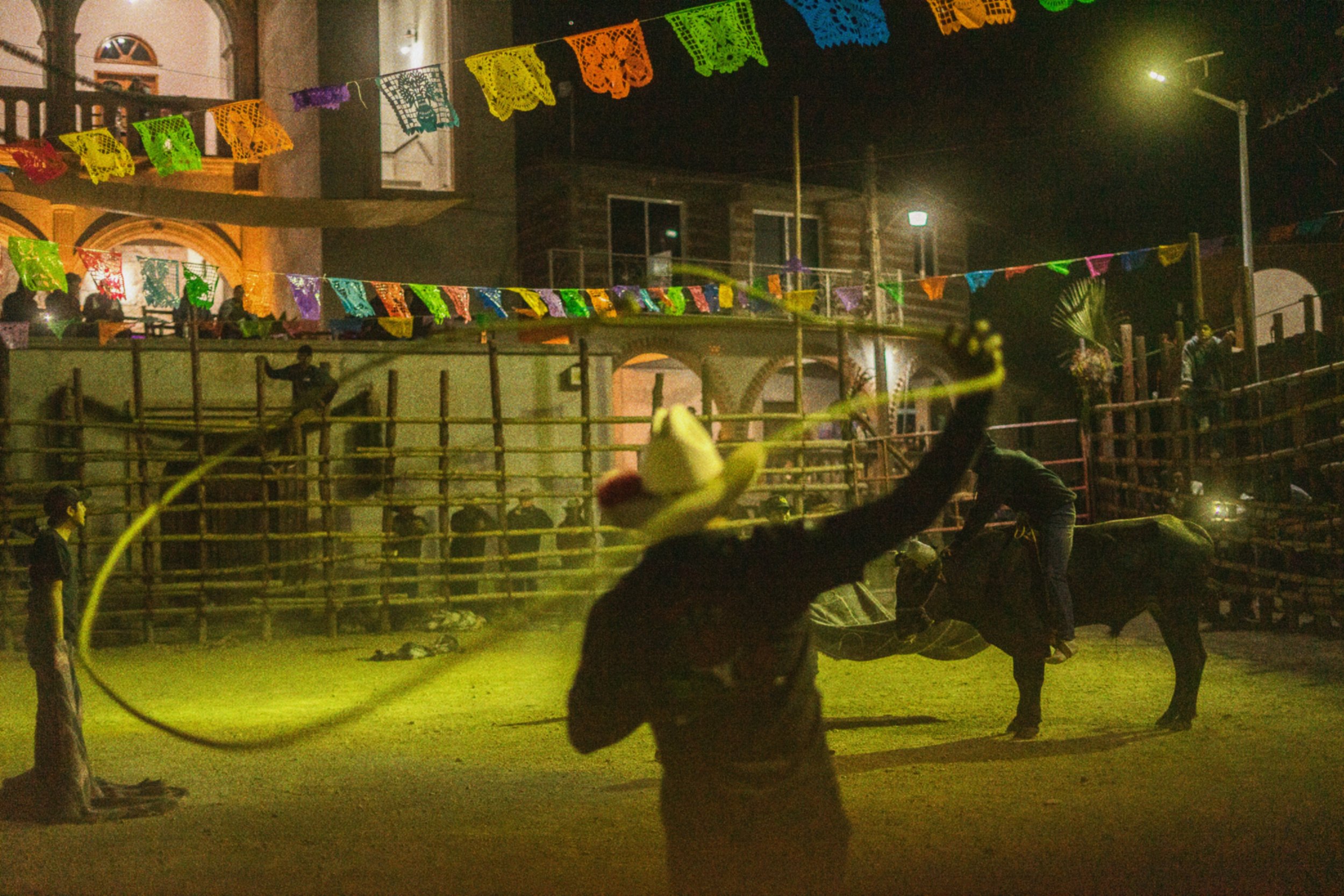 The riding of the clown. A tradition is for the clown to open up the jaripeo riding the first bull. In the town there is a diffrent stlye to ride the bull. That style is riding the bull by the neck.