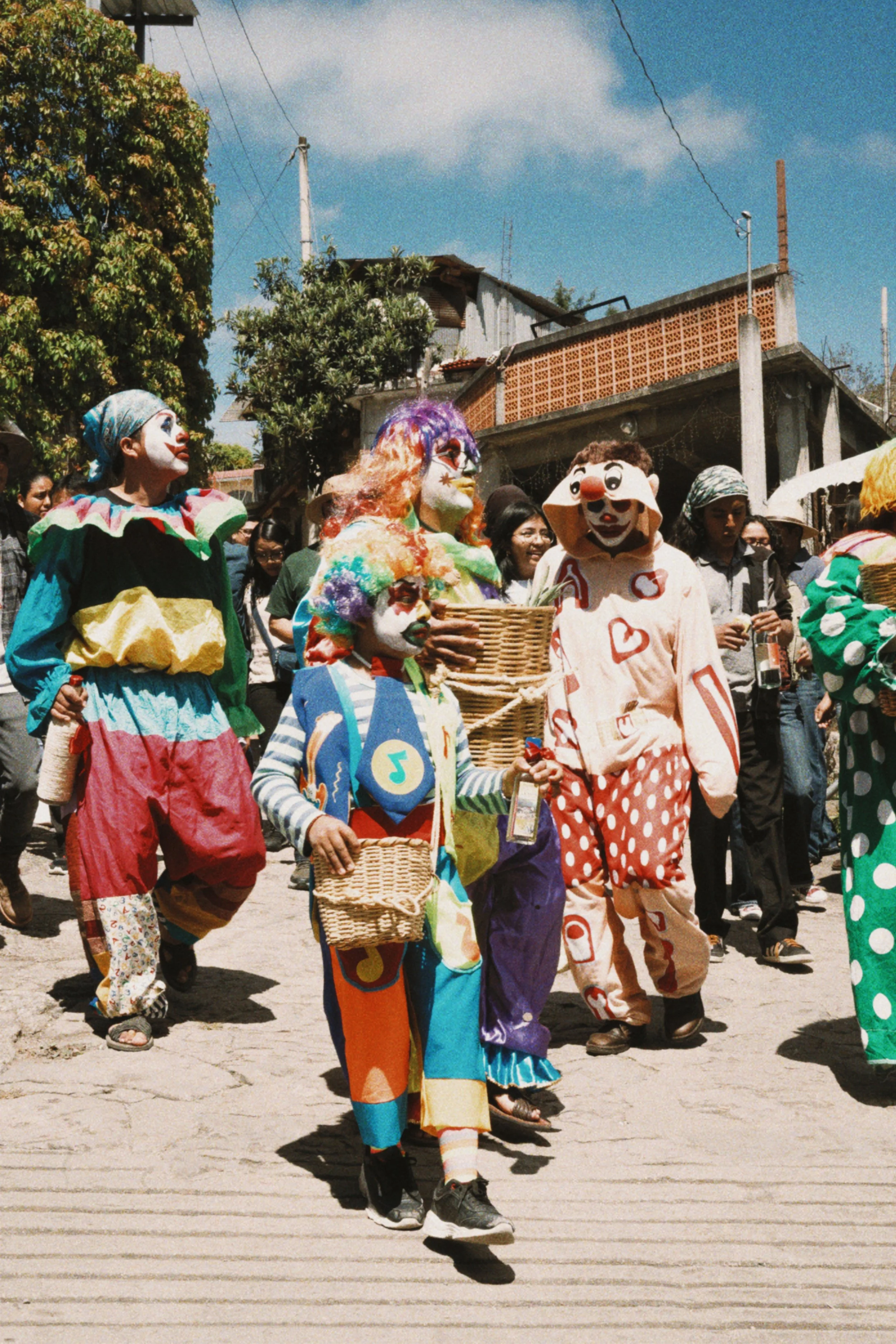 The clowns dress-up At the house of the president of the "Mesa de Jóvenes." They will be participating in the inaguration of the jaripeo. They shout some fun versus, dance, give out mezcal, throw some candy and fruit.